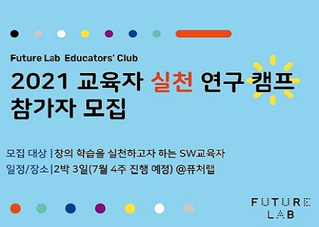 퓨처랩에서는 "SW교육은 어떻게 창의학습으로 전환되는가?" 웨비나 후속으로 오는 7월 22일(목)~24(토)까지 퓨처랩에서 <2021 교육자 실천연구 캠프>를 개최합니다.